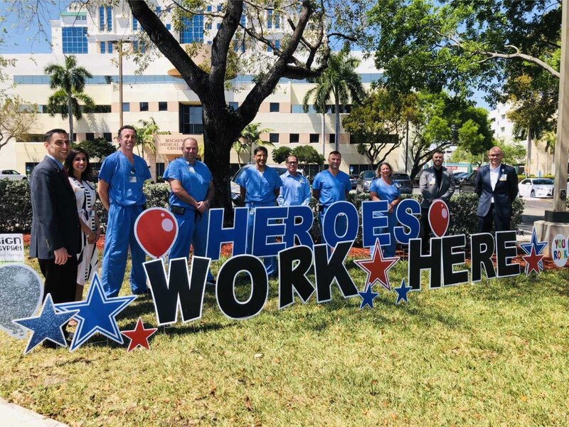 Aventura Heroes Work Here Aventura Hospital and Medical Center, Heroes Work Here: From left, Lee Chaykin; Jalima Hernandez, Chief Financial Officer; Eric Schiffman, MD; Gerardo Kahane, MD; Marc Gibber, MD; Jesse Gabuat, Chief Nursing Officer; Allan Stewart, MD; Debbie Perrin-Davis, Asst. Chief Nursing Officer; Chase Bennion, VP of Quality; and Damon Barrett, VP of Operations. (WPLG)