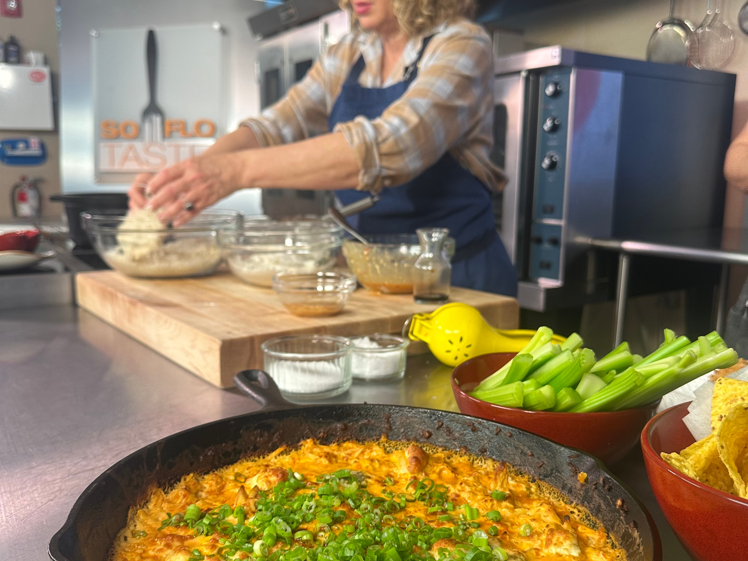 Once it’s well combined, mix with ½ cup of shredded cheddar cheese and allow to melt. Top the mixture with ½ cup of shredded cheddar and ½ cup crumbled blue cheese. Place in the oven until it turns golden brown. Serve topped with scallions and tortilla chips and celery on the side for dipping.