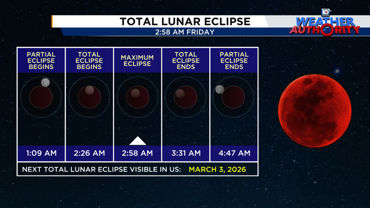 Totality lasts until 3:31 a.m. Friday. Then, the moon starts to slowly emerge from Earth’s shadow with the partial eclipse coming to an end by 4:47 a.m.